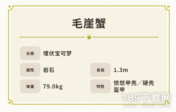 毛崖蟹拥有的特性“愤怒甲壳”,是本作登场的新特性。毛崖蟹的HP降到一半时,会因愤怒而降低防御和特防,而攻击、特攻与速度则会提升。