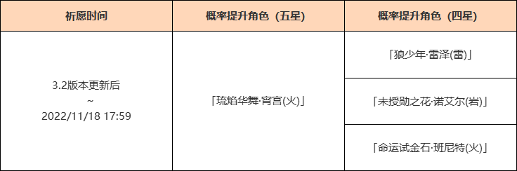 ●活动期间,四星角色「狼少年·雷泽(雷)」「未授勋之花·诺艾尔(岩)」「命运试金石·班尼特(火)」的祈愿获取概率将大幅提升!