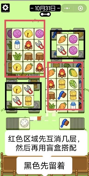 1.红色区域先互消几层,后面再用盲盒搭配着消,我是到图2那里才用盲盒.