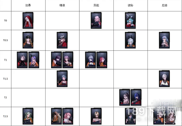 2、t0.5多为辅助性角色。澈作为真正的平民战神,必杀大范围破2核且耗能少,破核能力力压半个诡秘职业,被动有珍贵的易伤,顶级工具人。兰利强在一枷锁有易伤,aoe能力不俗但对boss伤害在精准里倒数。女仆是目前最强破核位,平民战神之首,大招是范围破核伤害,可以全图位移不耗移动次数,有着破怪的最后一核则能刷新大招的机制,本身可以存一次大招,反复触发效果可以连续放多个大招,使得破核能力顶级且伤害也不错。哈梅尔是唯一的不间断群奶,随时间推移逐渐变成全图奶,被动有全队伤害减免,开专后可以切换形态为毒奶,对己方伤害减免变成对敌挂易伤,切换形态CD短且底层逻辑被视作必杀技,方便多次触发需要开启必杀才能享受的烙印效果或角色技能。