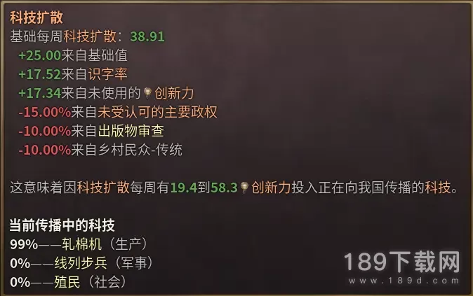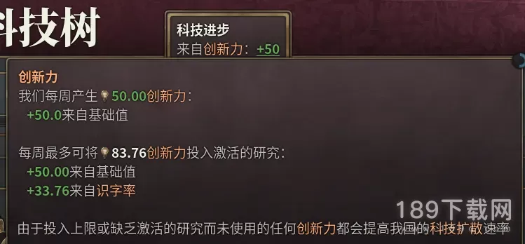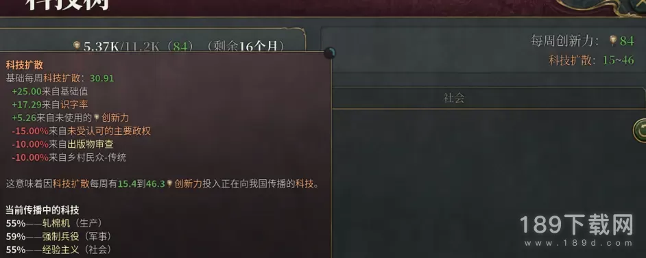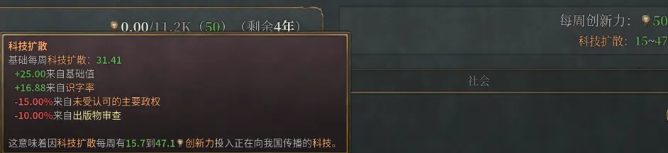 科技扩散+创新力自动就能很快研究一些被传播科技,每个大学+2点,算上各种buff,21个大学大概+50点。