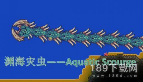 渊海灾虫是困难模式的Boss,可以在硫磺海生态中的任何时期生成。它是荒漠灾虫水生及中毒变异后的变种,它们有着相似的掉落,却有着显著不同的行为。