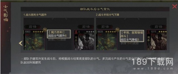 除先前蓝贴中提到的行军距离、补给范围等战略因素可对士气造成影响以外,处于建筑外的部队也将根据战斗结果改变部队士气:若战胜强敌,则部队士气会提升;而若陷入苦战,则部队士气也会下降,士气改变将持续影响直到部队返回所属建筑。部队士气的高低最终将在战斗中影响武将战法发动率与生效几率。