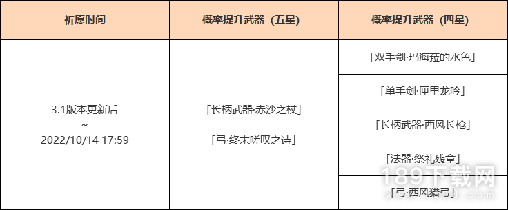 活动期间,限定四星武器「双手剑·玛海菈的水色」、四星武器「单手剑·匣里龙吟」「长柄武器·西风长枪」「法器·祭礼残章」「弓·西风猎弓」的祈愿获取概率将大幅提升!