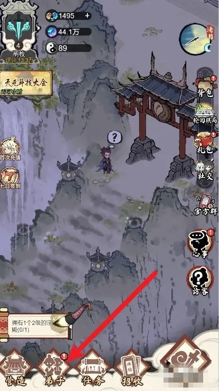 在手机上打开游戏,在游戏界面里,点击下方的弟子。
