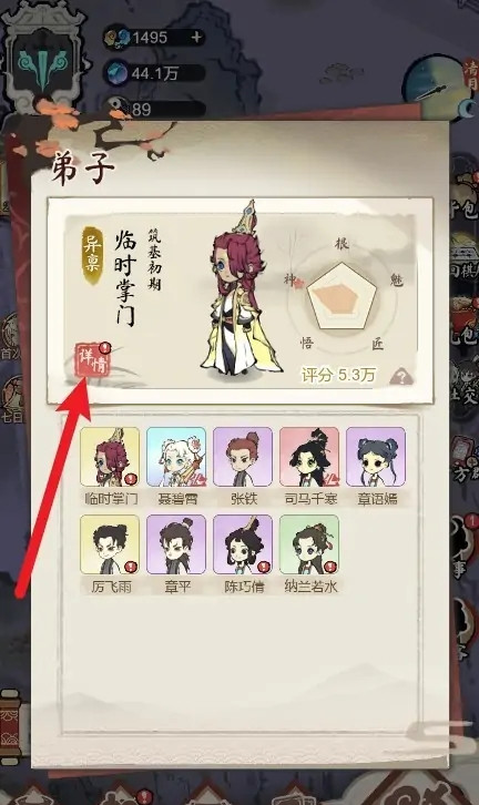 然后在弟子界面里,点击弟子下方的详情按钮。
