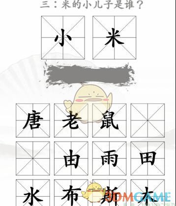 3、第三题玩家只需要将小米两个字放入格子中就会答题成功。