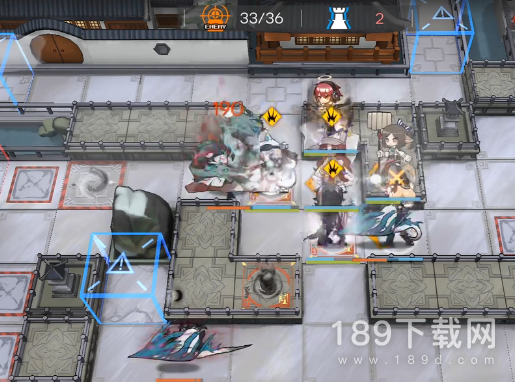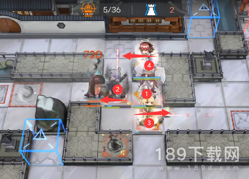 接下来等到得意和先锋接触后,部署法系近卫输出。左边“妒”登场后如下图所示用砾卡住,让能天使过载解决(解决后撤退砾)。