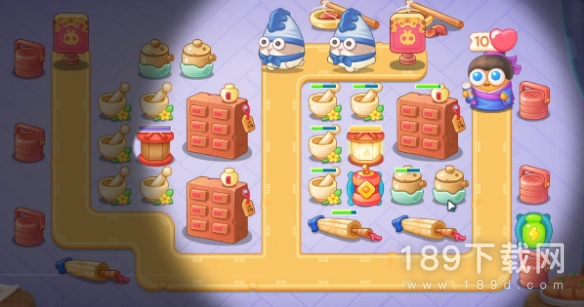 9、第九波现在左下角增加一个泡泡塔,在左中增加一个鞭炮,火力不够可以在泡泡塔右边增加瓶子炮,具体塔防如下。