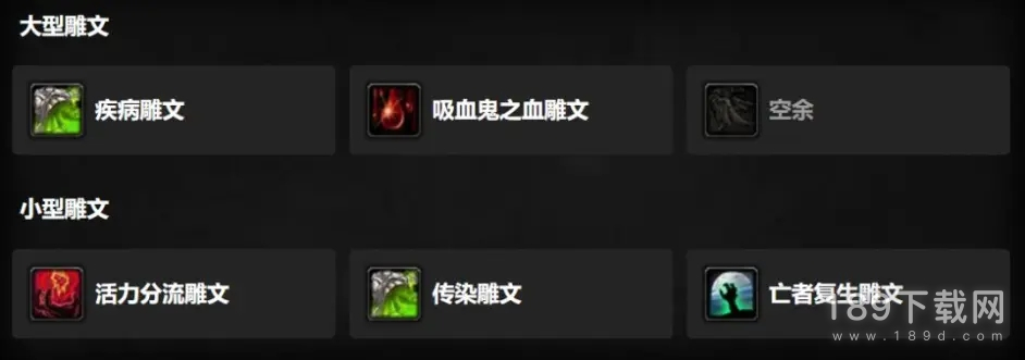 血DK的雕文没什么争议,大雕文用疾病雕文和吸血鬼雕文,小雕文则用活力分流、传染和亡者复生。