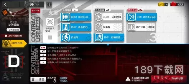 先说词条选择上,3个1级词条全部选上,对于敌人强化的幅度不算是特别的高,所以全选上也没什么威胁,2级词条禁掉重装和特种,3级词条降低我方攻击力,这个是低保词条,必须要选上的。