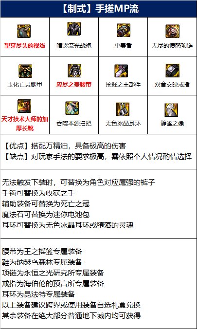 该流派以MP流为核心,搭配手搓装备,强化不在技能栏里面的技能。虽然该搭配具备极高的伤害,但需要玩家拥有较高的手法技巧才可以打出最大化伤害。