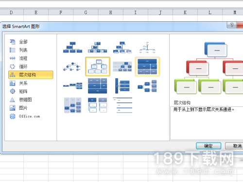4、在SmartArt图形中选择“层次结构”中的合适类型,单击确定。