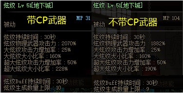 战法CP武器的属性特化了炫纹技能,词条1的自动发动降低了炫纹的操作量,并且极大的增加了炫纹的伤害占比,增强了战法的续航能力。整体伤害增加量属于偏低的水平,不过对于炫纹的特化让炫纹伤害在伤害占比甚至超越觉醒,整体上比制式武器要强。