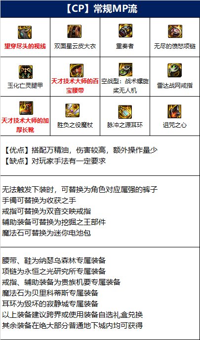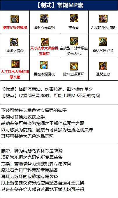 常规MP流主要以天才技术大师的百宝腰带、天才技术大师的加厚长靴和望穿尽头的视线为核心,搭配重奏者、无尽的愤怒项链、雷达战网戒指、脉冲之源耳环和诅咒之心等强力散件,使得该流派具备较高伤害,但MP消耗量巨大,需要玩家在背包中准备大量MP恢复药剂来保障技能的消耗。