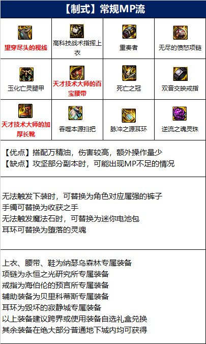 该流派以MP流为核心,搭配手搓装备,强化不在技能栏里面的技能。虽然该搭配具备极高的伤害,但需要玩家拥有较高的手法技巧才可以打出最大化伤害。