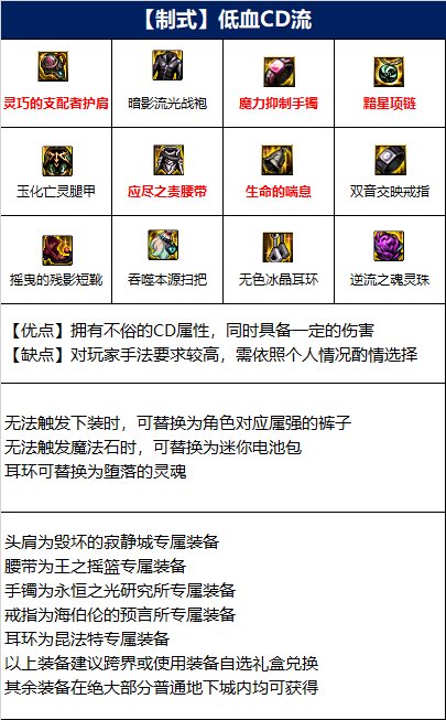 该流派主要是以CD装备为主,在具备较高的CD缩减属性时,还具备了一定的伤害,但该流派需要保持低血量才可以打出最大化的伤害,因此对玩家的手法有一定的要求。