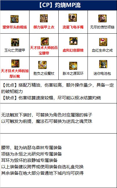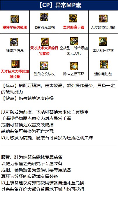 元素师110级版本因为cp武器的特化技能效果较为出色,因此装备均围绕CP武器搭配,流派共有3种,分别为:灼烧MP流、常规MP流和异常MP流。若玩家选择制式武器的话,则只推荐走常规MP流,原因是其他流派都不怎么强力。