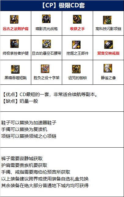 奶妈110级版本因为cp武器的特化技能效果较为出色,因此装备均围绕CP武器搭配,流派共有3种,分别为:至高奶量流、极限CD流和极限移速流。