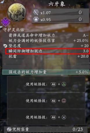 六牙象守护灵有“瞬间防御增加妖力3点”的特殊词条,瞬间防御就是敌人快打到的时候按防御完美弹刀,类似于太刀的逆波山风,全部武器都能使用。
