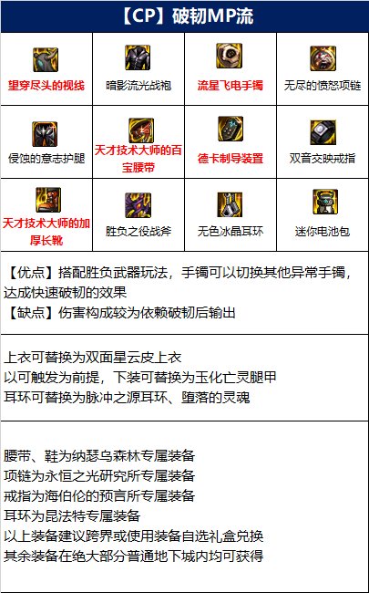该流派是围绕CP武器组成,以MP装备为核心,搭配各种属性异常装备,可以有效的发挥出CP武器的技能特化效果,此外,该流派还具备了一定的破韧能力。