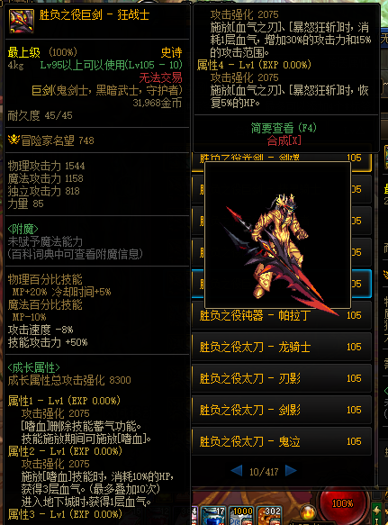105级胜负之役巨剑狂战士是无法交易的史诗级装备,拥有45耐久度,装备后可以增加1158魔法攻击力和1544物理攻击力。