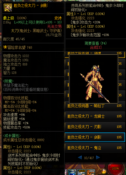 《DNF》105级胜负之役太刀剑影是无法交易的史诗级装备,拥有45耐久度,装备后可以增加1351魔法攻击力和1222物理攻击力。