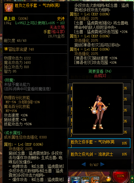 105级胜负之役手套男气功师是无法交易的史诗级装备,拥有48耐久度,装备后可以增加1480魔法攻击力和1222物理攻击力。