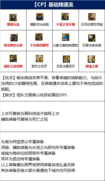 战斗法师110级版本因为cp武器的特化技能效果较为出色,因此装备均围绕CP武器搭配,流派共有3种,分别为:基础精通流、感电MP流和无色MP流。
