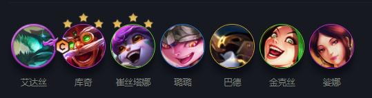 1.棋子构成:艾达丝、库奇、崔丝塔娜、璐璐、巴德、金克丝、娑娜