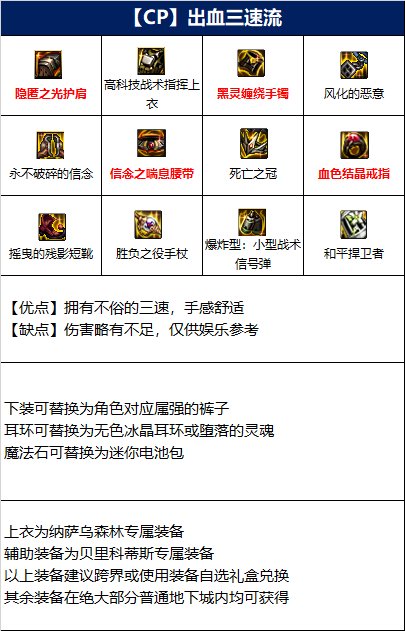 整套装备以出血流装备为主,搭配三速装备,使得该搭配具备不俗的三速,操作手感一流。但该搭配的伤害略有不足,仅供娱乐参考。