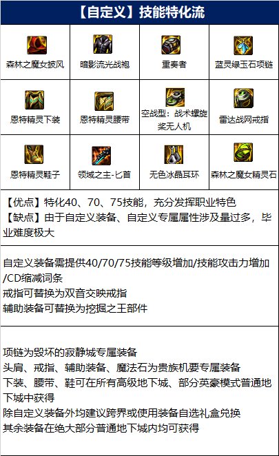 技能特化流主要是围绕自定义武器和自定义装备来进行搭配,其中武器、头肩、下装、腰带和鞋部位的装备都是自定义装备,这些自定义装备主要选择40级、70级和75级技能进行特化,充分发挥刺客这个职业的特色。