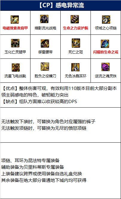 该流派以感电异常为输出核心,完美利用了110级版本大多数BOSS弱感电的特色。虽然该搭配具备极高的伤害,但伤害结算速度较慢,处于组队状态下很难收获高DPS。