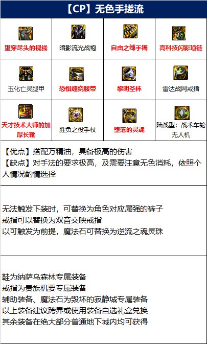 以无色流装备为核心,搭配手搓装备,强化不在技能栏里面的技能。虽然该搭配具备极高伤害,且无色消耗量极大,但玩家还是需要拥有较高的手法技巧才可以打出最大化伤害。