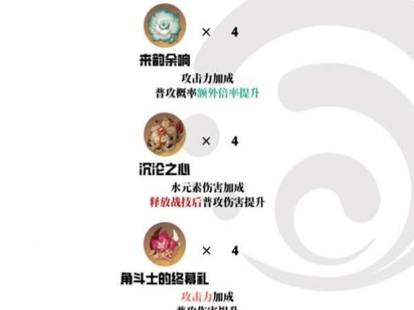 ③.在上文的武器与圣遗物套装指望的图表中,余响、水套、角斗士三者在每把武器上的差异并不大,是以,若是已经有了词条突出的水套、角斗士那么能够取舍不刷去余响套