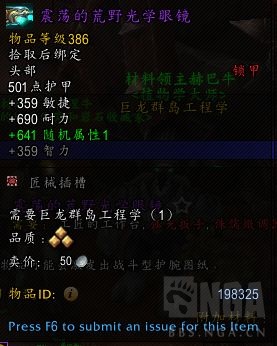 工程头是最好获得装备之一,毕竟直接可以从训练师那里学习,单属性的优势可以让你规避不必要的属性,至于护腕就稍微差强人意了,护腕居然还要通过制造其他装备来领悟,实在是太浪费时间和材料,加上10.0工程制作东西较为繁琐(打螺丝)我不建议马上搞,甚至迫不得已不搞。