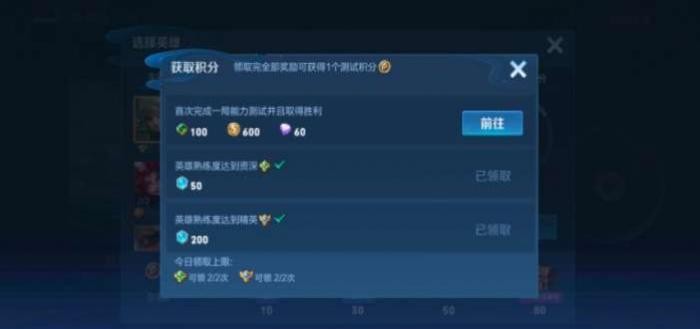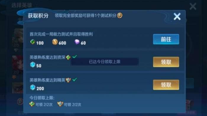 天天选择两位高纯熟度的英雄去通关才具尝试,领取奖励后一共能拿到2个尝试积分。