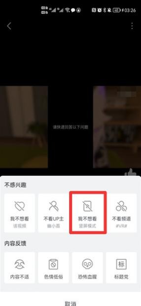 1、在哔哩哔哩竖屏播放中,点击右上角三点。2、在展开的选项中,选择不感兴趣。3、在展开的不感兴趣中,点击我不想看竖屏模式即可。