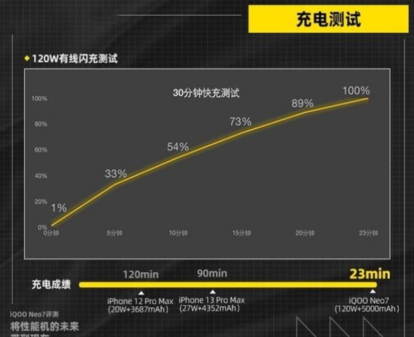 充电方面,120W超快闪充照样没牵挂捆扎。凭据实测,iQOO Neo7在23分钟内可将电量从1%充至100%,15分钟便可充至73%电量,在5000mAh大电池的手机中,iQOO Neo7的充电速率是特别可观的,相信这在平常使用中会极大提高我们体味。