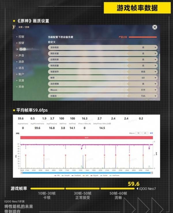 在《原神》 (高画质+60帧)30分钟尝试中设定下,笔者绕着蒙德城跑图,iQOO Neo7的均匀帧率抵达了59.6fps,仅在一些情景下呈现了小幅动摇,全体游戏体味极端畅通,游戏体味还是不错的。