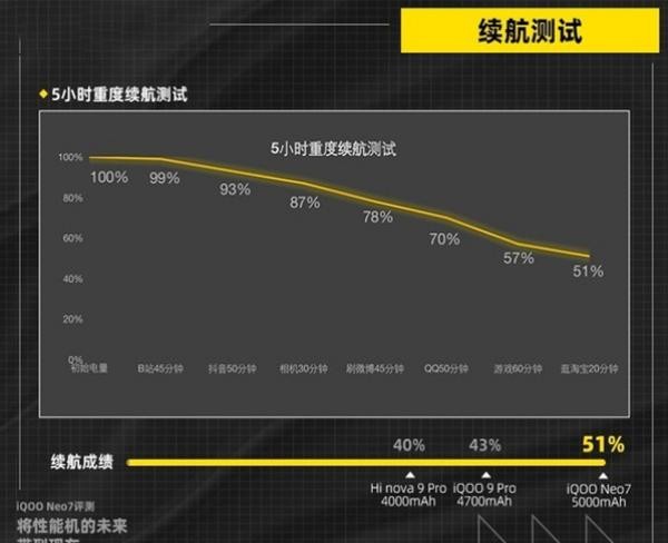 从结局中能够看到,颠末5小时尝试后,iQOO Neo7节余电量为51%,在我们尝试机型中属于一个比较靠前的成绩,抵达了主流程度,能够轻便满意网友成天的使用需要。与此同时,iQOO Neo7异样思索到了电池寿命问题,其含有的智慧充电战略能够智能识别网友充电情景、配合分歧的充电战略;同时遵照老化水平下降满充电压和最大充电电流,下降电池耗费、耽误使用寿命。