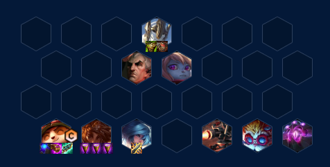 阶段装备少的时候,前排狂徒+后面一件成型为最优。只要前排顶住就更好打连胜,术士德玛提莫暂时不缺伤害,提莫装备晚点出来也没事。大后期还有多余装备可以给3星乌鸦或者2星皇子来个偷偷或者多余法装给琴女1件或者3件,不要给2件以免抢加里奥的光明装备,要特别注意!