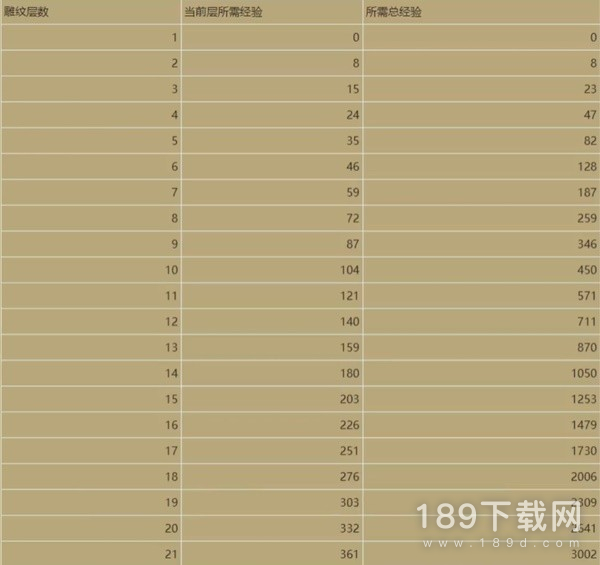 相信现在还有很多小伙伴雕纹没有升满,每级所需经验都已整理成表格方便查看。总共需要3000点左右才能满级哦!雕文等级最高只有100级,主线任务只能升到45级,需要约35小时;后期只能通过打怪来刷经验,但升级速度会变慢。