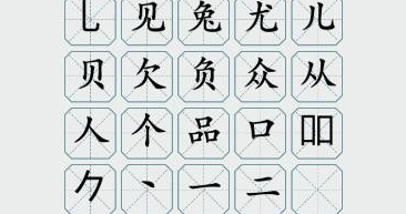 本关的可以找出二十个字为:丶、一、二、口、吅、吕、品、人、个、从、众、欠、负、儿、尤、兔、免、见、贝、乚。