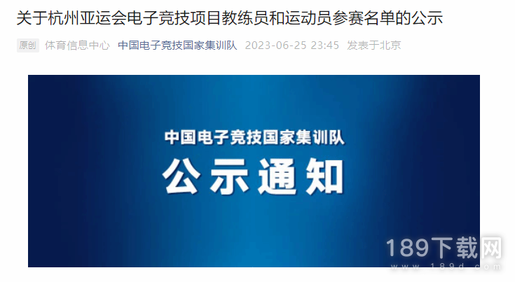 2023年6月26日,中国电子竞技国家集训队官方正式公布了杭州亚运会电子竞技项目教练员和运动员参赛名单。