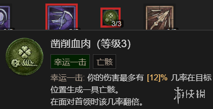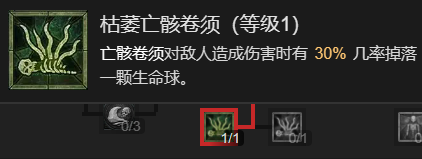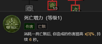 随后在使用3个技能点将亡骸技能中的亡骸卷须和分支技能强化亡骸卷须、枯萎亡骸卷须点出。