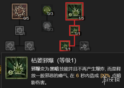 这个时候小伙伴们还可以获取到10个技能点了,先使用3个技能点分别将邪爆和它的技能分支强化邪爆、枯萎邪爆点出来。