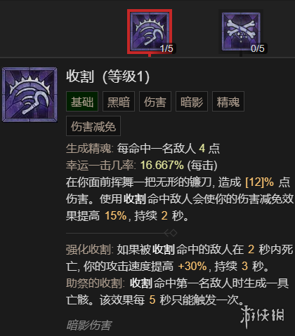 然后将白骨碎片加点去除获取3个技能点,然后使用3个技能点点出收割和技能分支中的强化收割、助祭的收割。