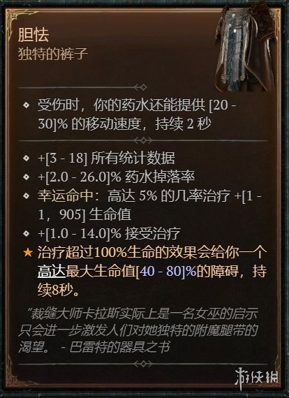 8、暗金传奇裤子装备胆怯,治疗量超过生命值的100%,会提供屏障持续8秒。