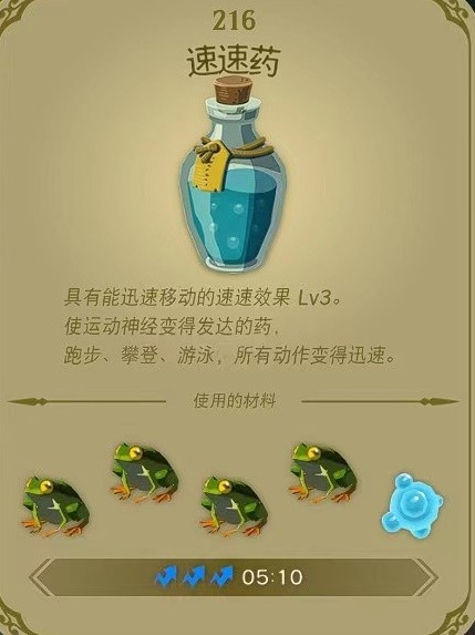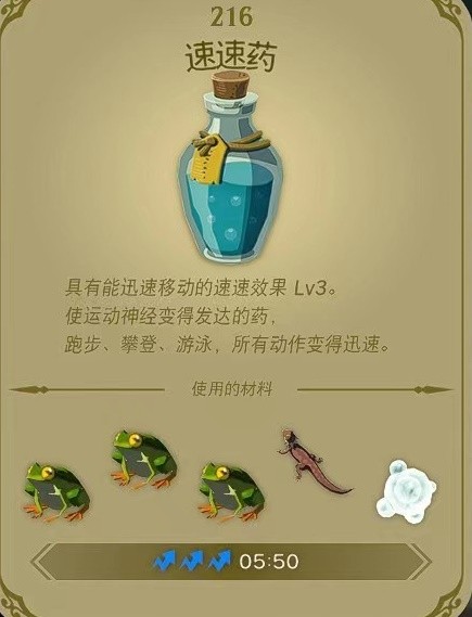 速速蛙3个+速速蜥蜴1个+丘丘胶1个=5分钟的3级速度药剂。